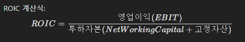 - ROIC가 높을수록 기업이 효율적으로 자본을 운용하며 수익성을 극대화한다는 의미